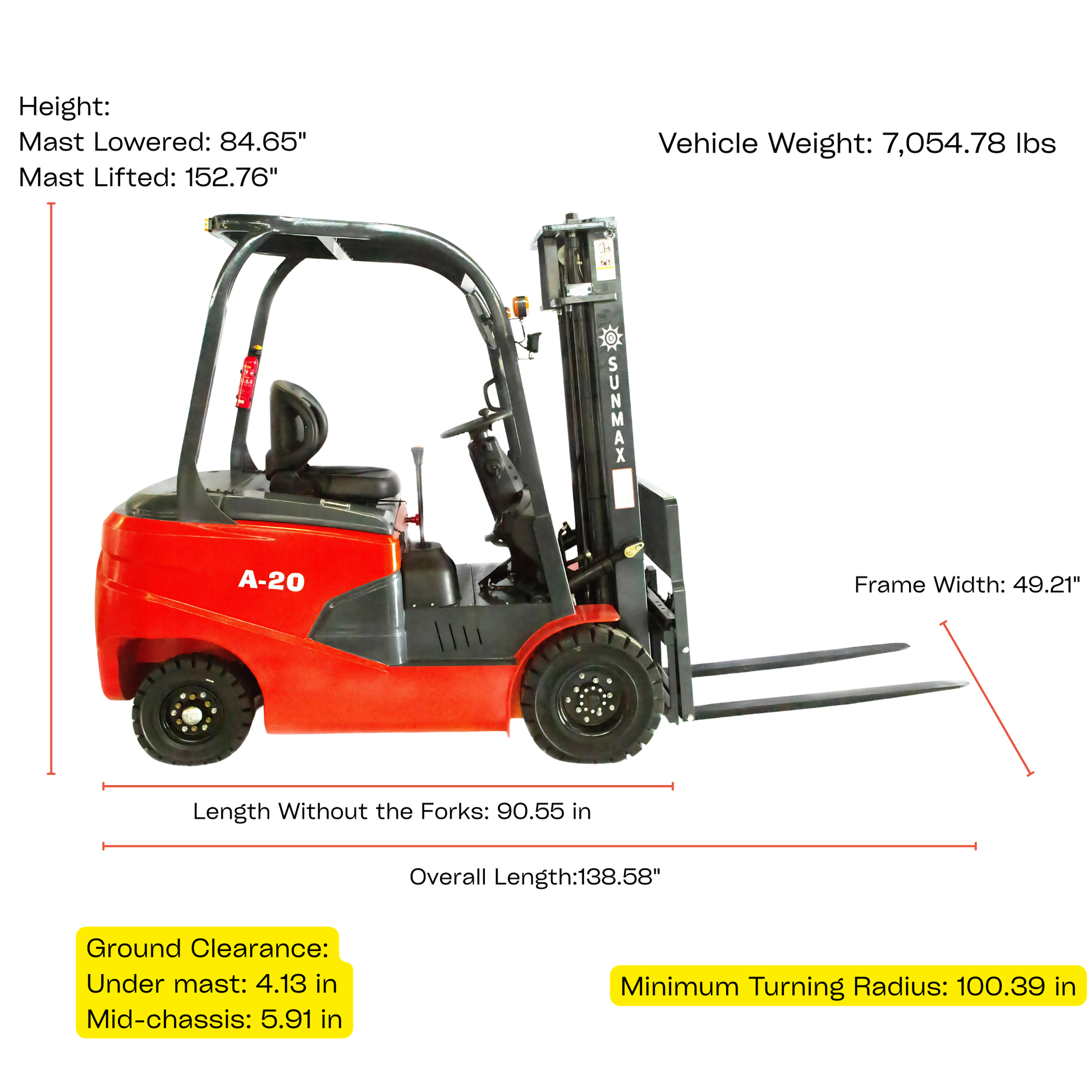 SUNMAX A-20 Electric Forklift is designed for efficient material handling in warehouses, distribution centers, and industrial environments. With a robust lifting capacity of 4,400 lbs and a maximum lift height of 118 inches, it offers exceptional performance, maneuverability, and operator comfort. Powered by an efficient AC motor system and equipped with hydraulic power steering, the A-20 is an ideal solution for mid-sized to heavy-duty indoor applications.